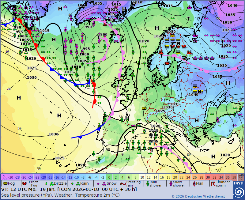Die Karte zeigt die Wetterlage am Montag, 19. Januar 2026 früher Nachmittag. |