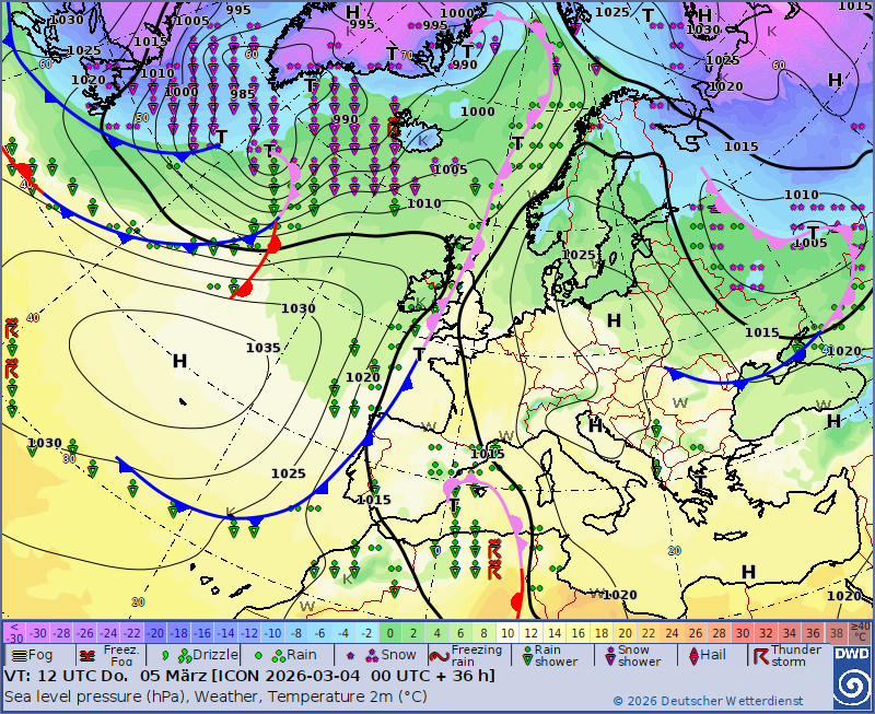 Die Karte zeigt die Wetterlage am Donnerstag, 05. März 2026 früher Nachmittag. |